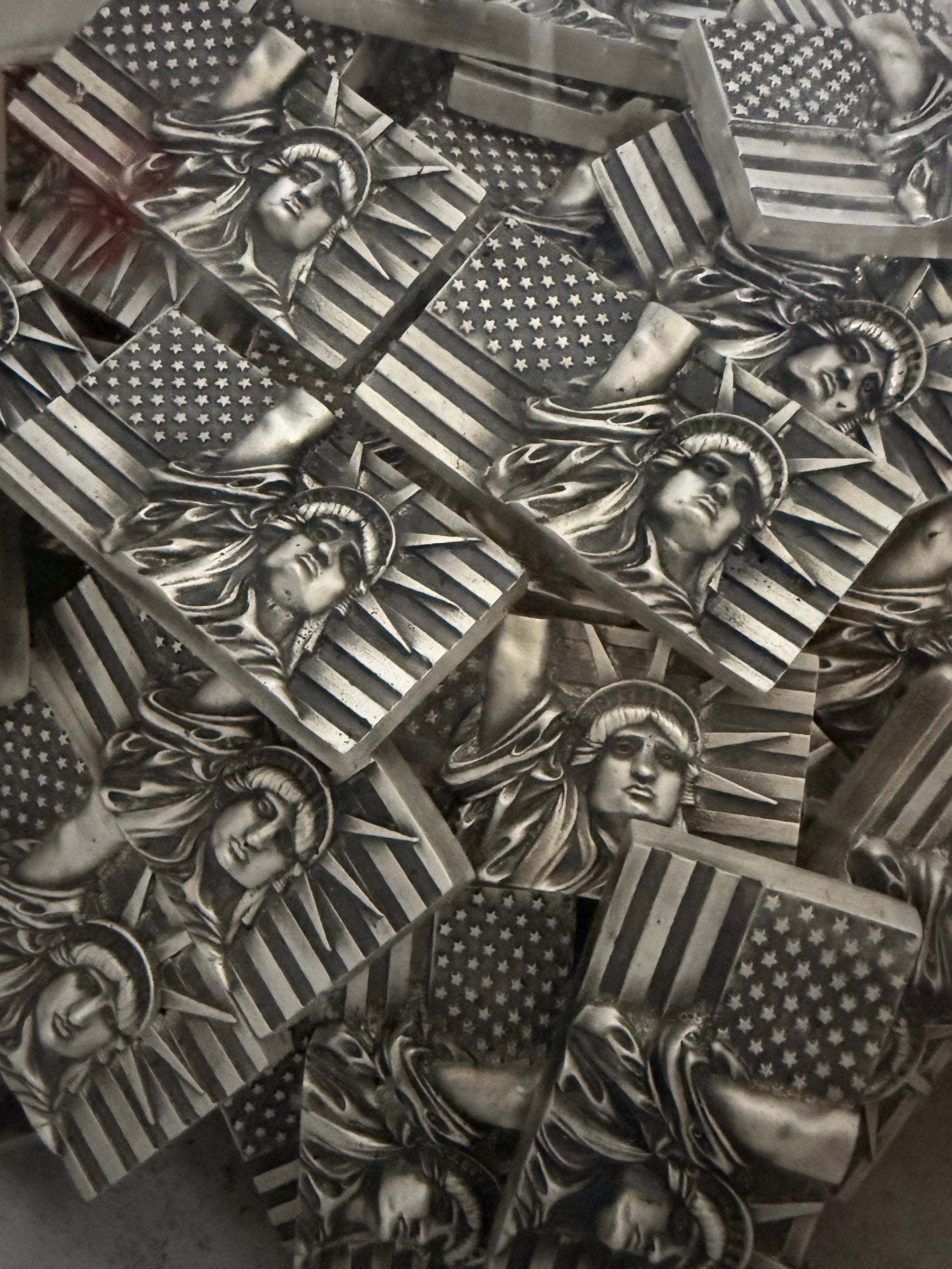 The Liberty Flag is a hand-poured silver ingot, designed and made by the top producer of sand-casted silver products in the US. Its antique finish and 3+ ozt weight (99.9% silver) make it a sought-after collector's item. Featuring a high relief image of the Statue of Liberty and American flag, this ingot is a patriotic addition to any collection.
